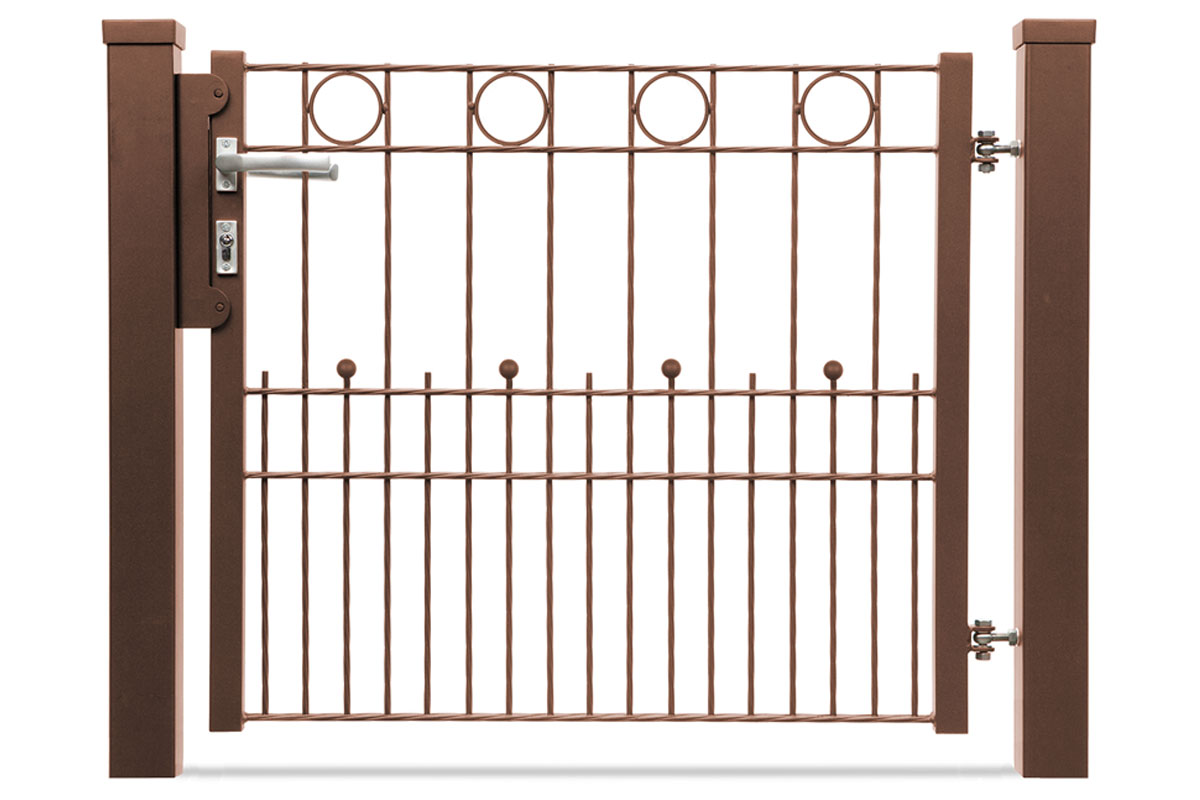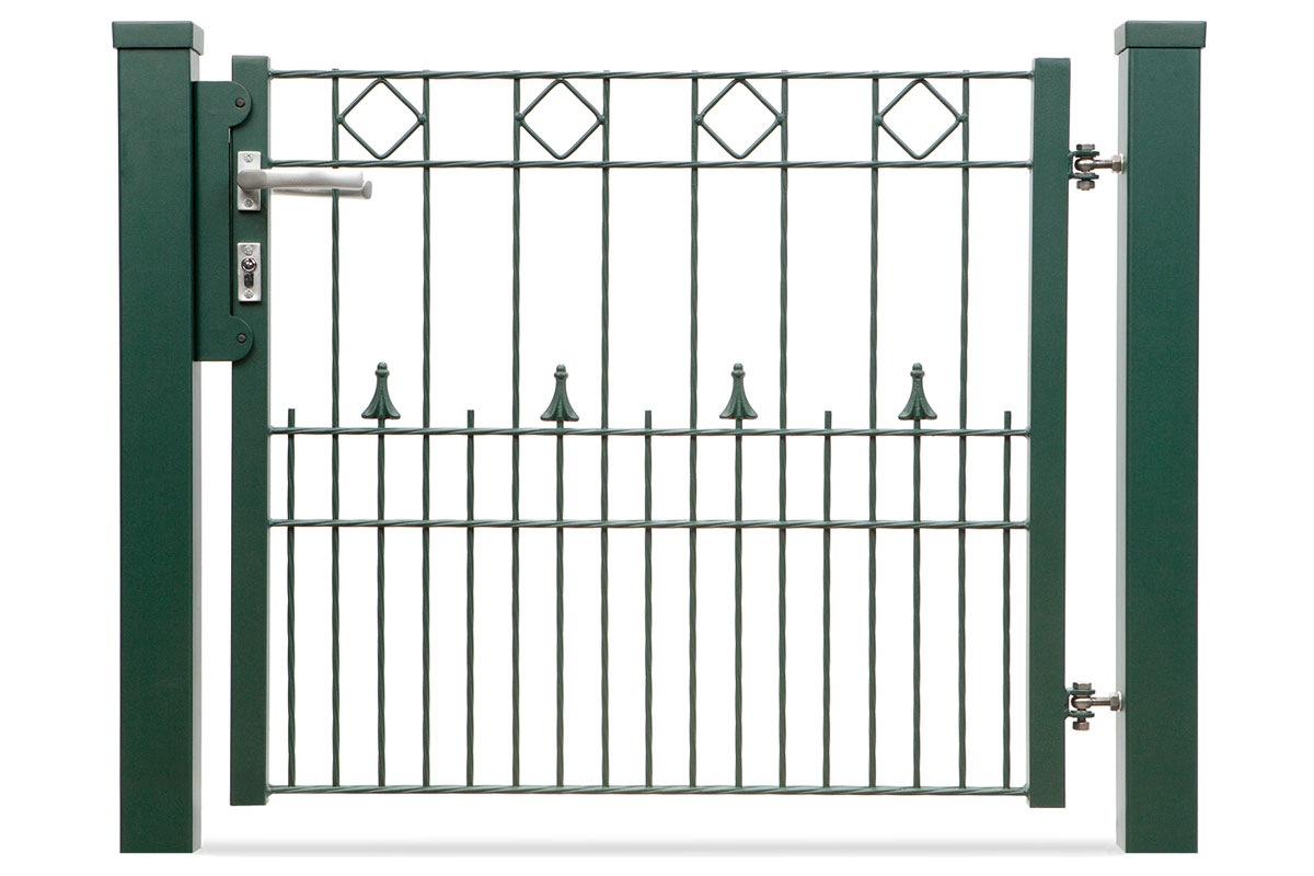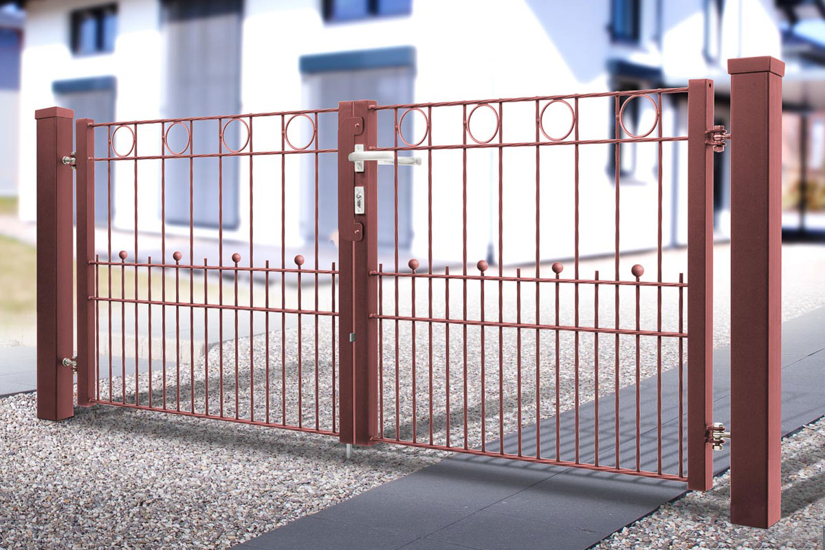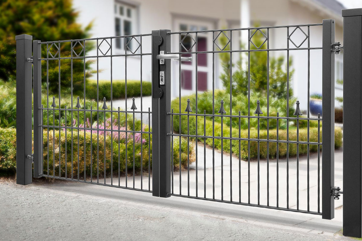 Schmucktore präsentieren sich als elegante, schmiedeeiserne Tore aus Doppelstabmatten. Anpassungsfähig in ihrer Gestaltung bilden sie in ihren ein-, zwei- oder dreiflügeligen Ausführungen den stilvollen Abschluss einer Zaunanlage. Formvollendete Ornamenttüren, nach den Elementen der Zaunmatten gestaltet, eine moderne Farbpalette sowie ihre erstklassige Qualität stellen nur einige der herausragenden Eigenschaften dieser Schmucktore dar.